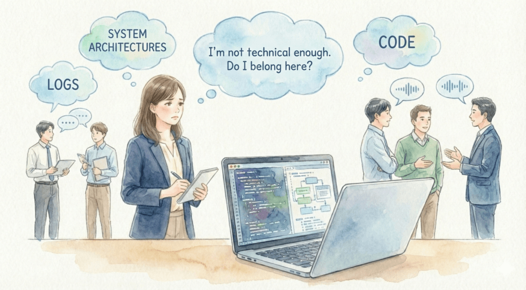 周囲には、システム構成、ログ、コードについて当たり前のように話すエンジニアがいました。