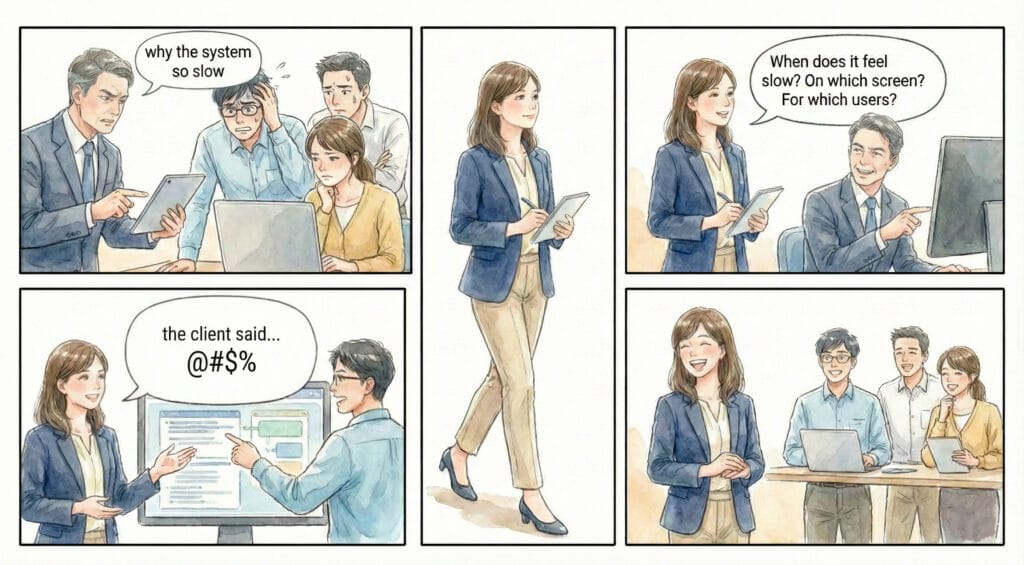 顧客の本当の要望を丁寧に理解し、それを 開発チームが実現できる形に整理して伝えることが重要な役割です。