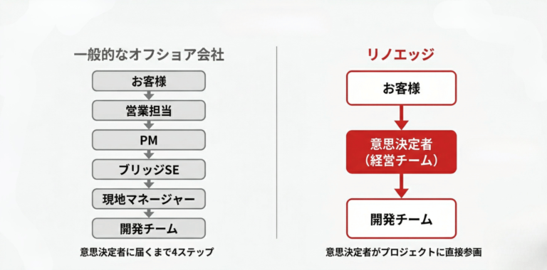 リノエッジの社内公用語は英語です。 御社には日本語で対応しつつ、 開発チームとは翻訳なしで直接つながっている。 だから、技術的な議論が表面的にならない。 ちゃんと議論しなきゃいけない場面では、目と目を合わせて、納得するまで話ができます。